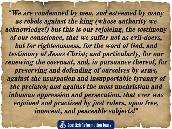 “…the laws establishing prelacy, and the acts, orders, and proclamations made for compliance therewith, being executed against us by military force and violence. And we, with others, for our simple forbearance, being fined, confined, imprisoned, exiled, scourged, stigmatized, beaten, bound as beasts, and driven unto the mountains for our lives; and thereby hundreds of families being beggared, several parishes, and some whole countryside’s exceedingly impoverished…. there was no other remedy left to us, but that last of necessary self-preservation and defence….it cannot in reason or justice be reputed a crime, or condemned as rebellion by any human authority.”